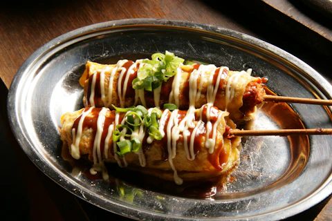 揚げた串かつを玉子で巻いてデミカツソースで仕上げました。野菜・果実とビーフの旨みが効いたコクのあるソースと、ザクっとした歯ごたえが人気の秘密です。