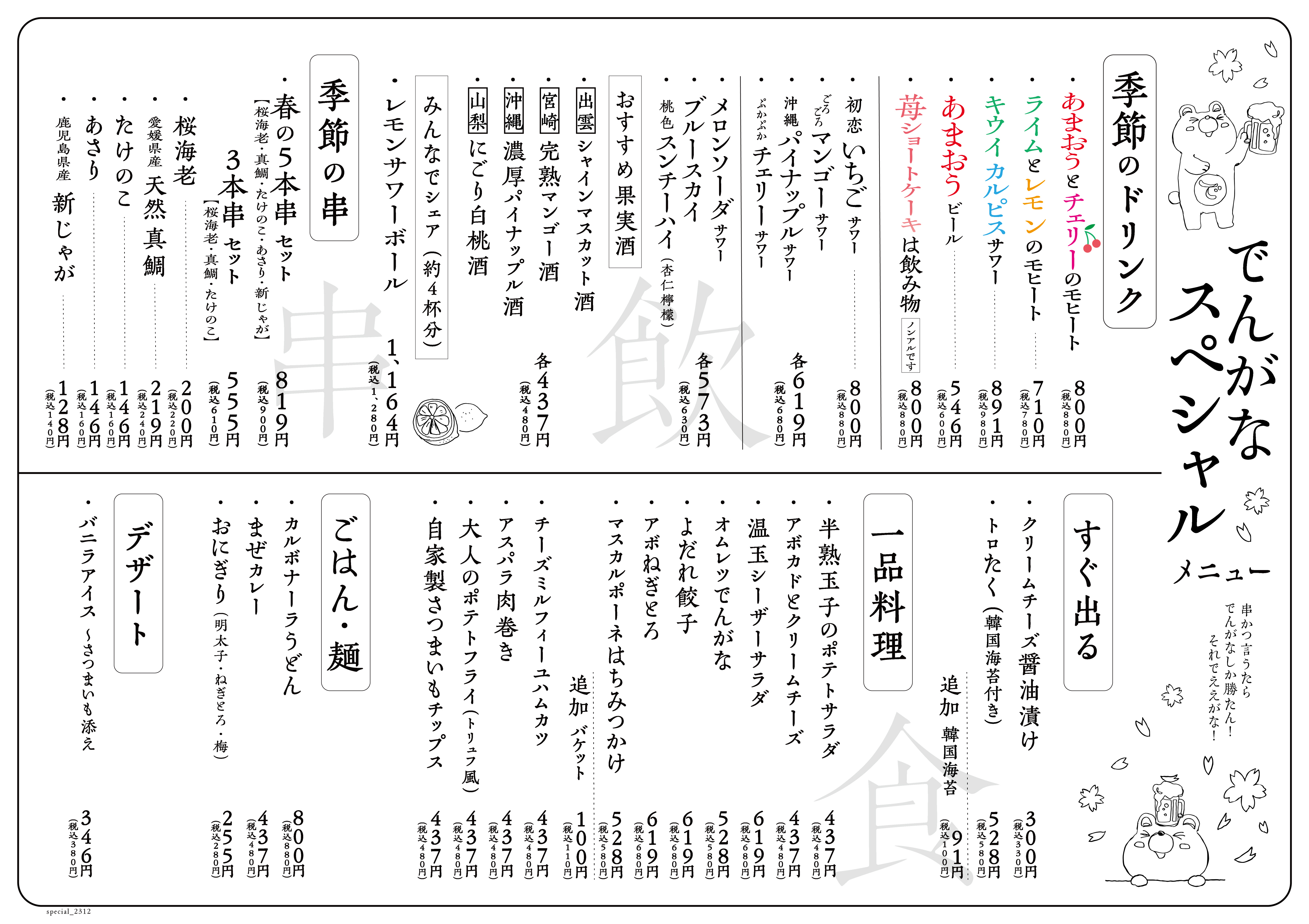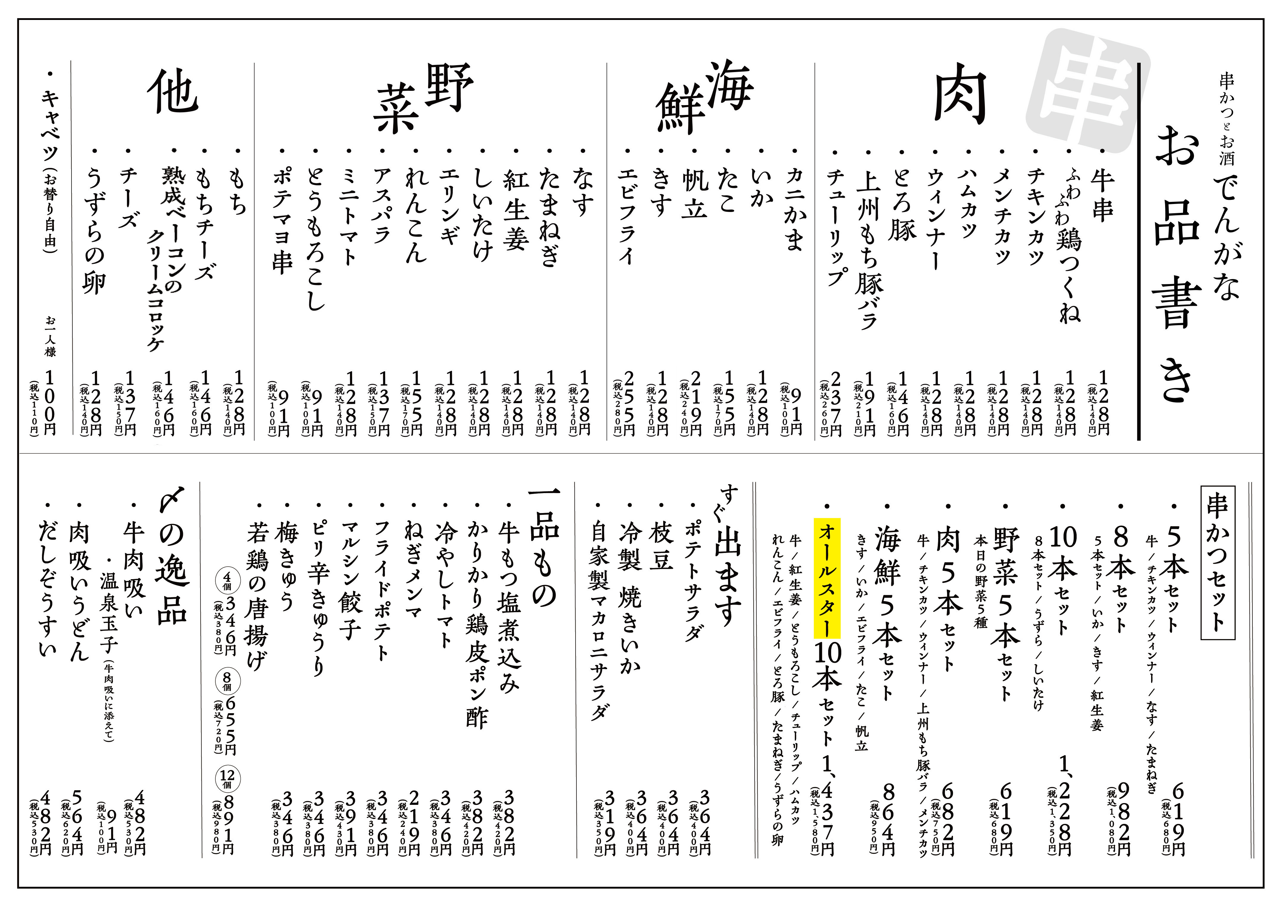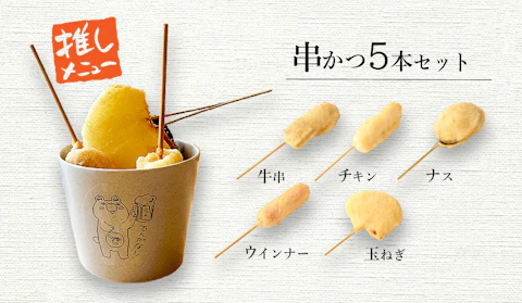 でんがな自慢の串かつは山芋をブレンドした衣、独自開発したキメの細かいパン粉、厳選したオランダ産ラードの揚げ油を使い、外はサクッと、中はモチッとした食感に仕上げています。また、さっぱりとしながらコクのあるオリジナルの特製ソースが味を引き立てます。