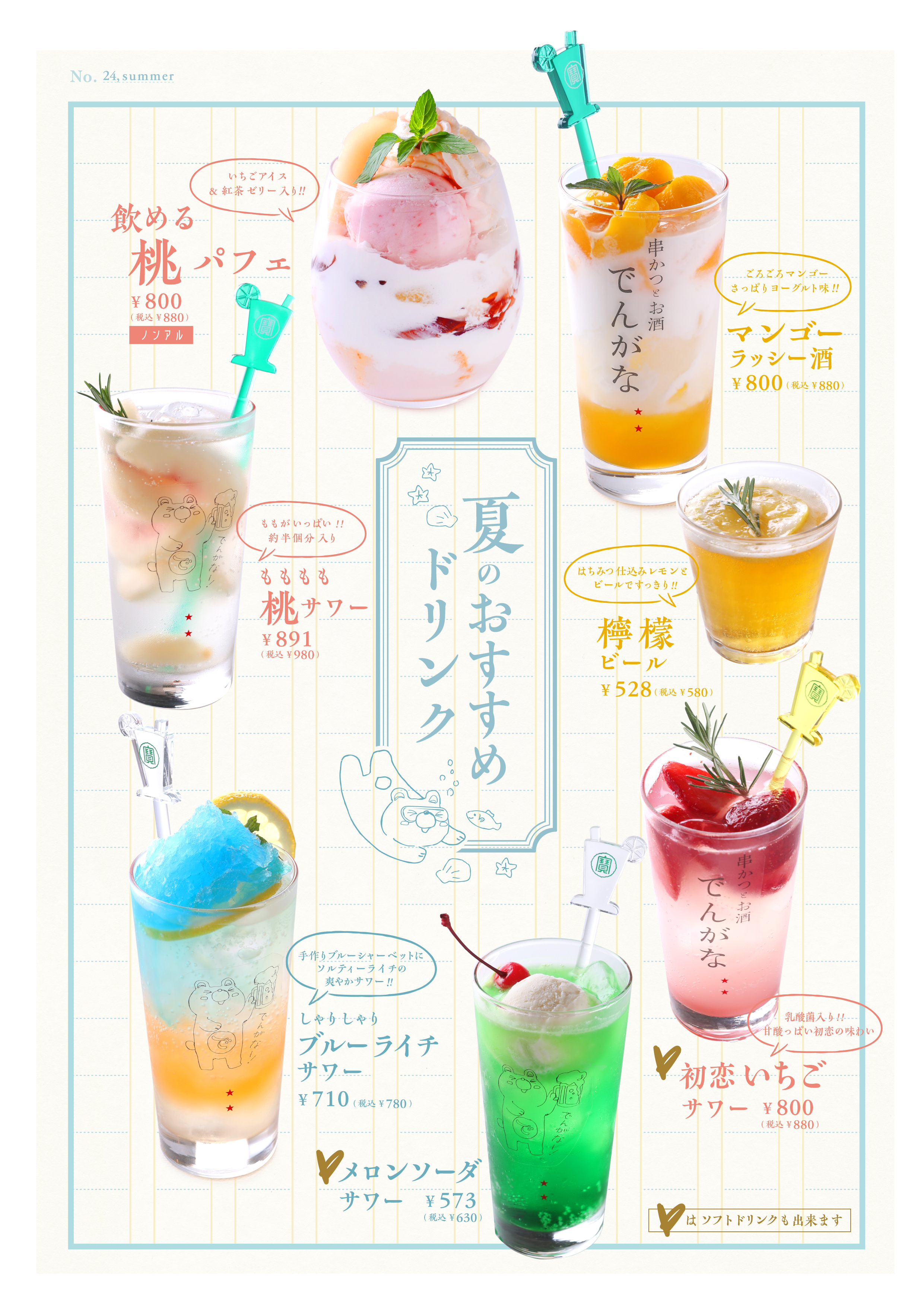 ネオ居酒屋「串かつとお酒 でんがな」は、 2024年6月3日(月)から新作を含む、夏のおすすめドリンクを販売いたします。