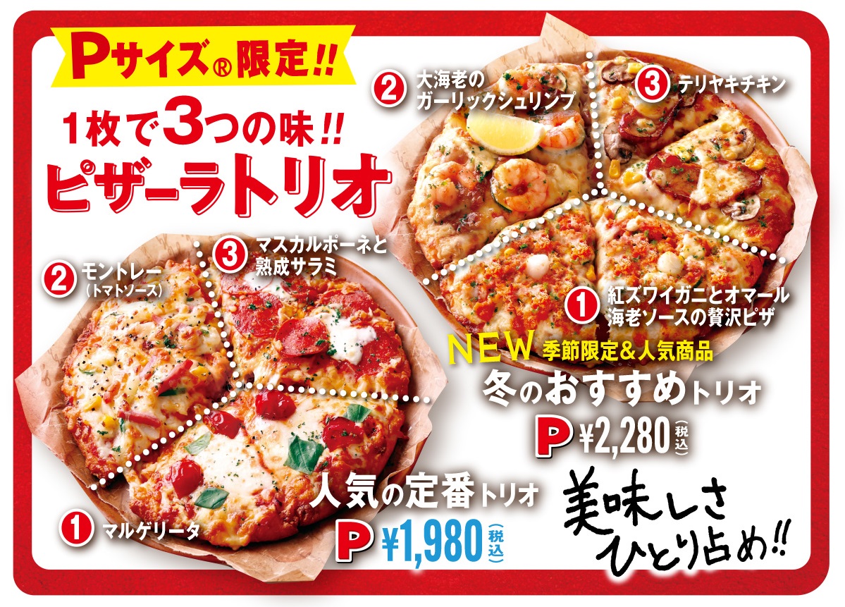 2023.10.30ピザーラ新作と人気の3種類を1枚で『冬のおすすめトリオ』新発売!! 気軽に楽しめるピザーラのPサイズ!!2023年11月1日(水)~ 期間限定宅配ピザ「PIZZA-LA」は、2023年11月1日(水)~期間限定で『冬のおすすめトリオ』を発売いたします。資料をダウンロード