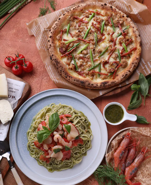 イタリアンレストラン「TO THE HERBS(トゥ・ザ・ハーブズ)」では、2025年6月13日(金)より『サルシッチャとサラミ にんにくの芽のピッツァビアンカ』、『甘海老と帆立の冷製ジェノベーゼパスタ』を期間限定で販売いたします。