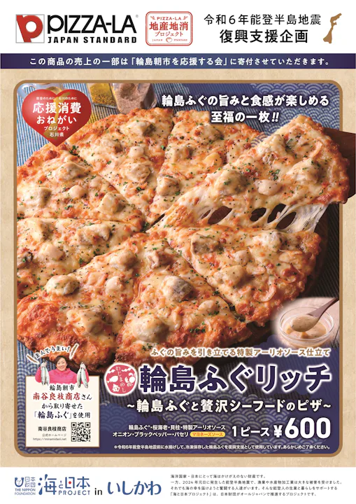 宅配ピザ「PIZZA-LA」は、同社「地産地消プロジェクト」の取り組みとして一般社団法人「海と日本PROJECT in いしかわ」と協力し、石川県輪島市の特産品「輪島ふぐ」を使用した地産地消ピザ『輪島ふぐリッチ』を全国のピザーラキャラバン、イベントで販売することを決定いたしました。