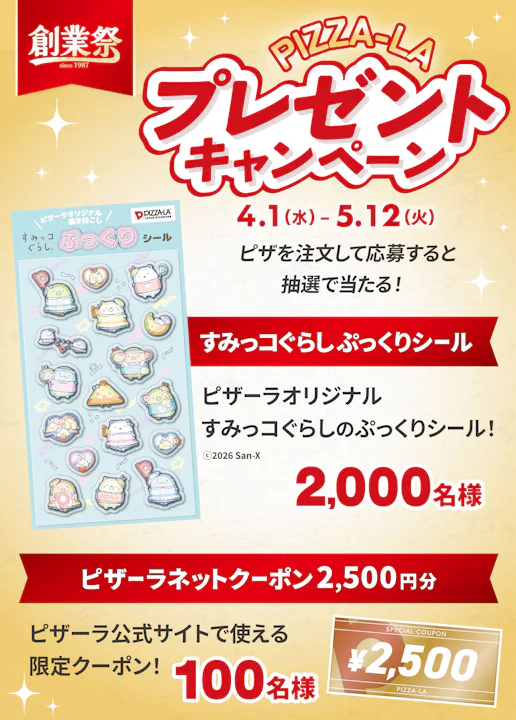 ピザーラオリジナル「すみっコぐらし ぷっくりシール」などが 合計2,100名様に当たる! 創業祭プレゼントキャンペーン開催