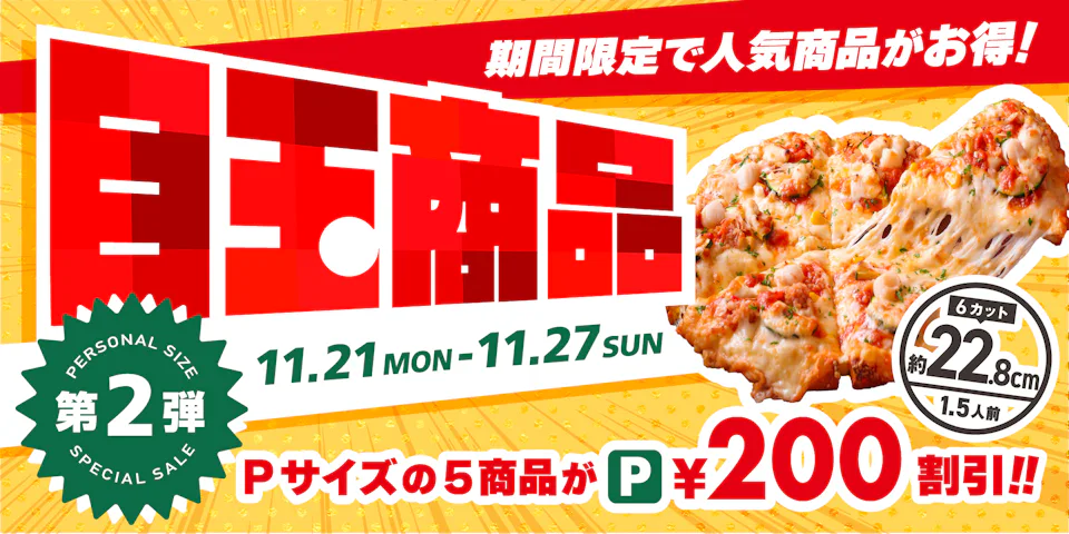 宅配ピザ「PIZZA-LA」は、【ピザーラ感謝祭】目玉商品 第2弾として、2022年11月21日(月)~11月27日(日)の7日間、ピザーラ公式サイト限定でP(パーソナル)サイズ5商品をお得な割引価格で販売いたします。