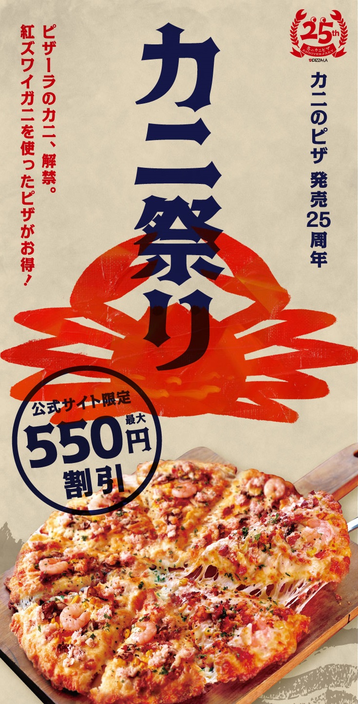 2023.11.15ピザーラピザーラ感謝祭カニ祭り!! 発売から25周年 ピザーラの冬の代名詞「カニのピザ」をお得に!2023年11月16日(木)~12月10日(日) ※ピザーラ公式サイト限定宅配ピザ「PIZZA-LA」は、「ピザーラ感謝祭」として、ピザーラ公式サイト限定でカニのピザを特別割引価格で販売いたします。資料をダウンロード