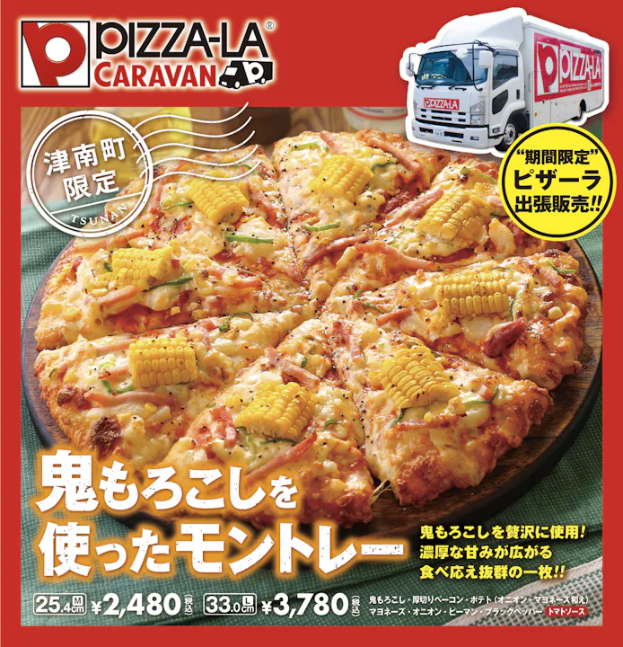「PIZZA-LA」は、移動販売「ピザーラキャラバン」で、出店場所の新潟県津南市の地産食材を使った特別メニュー「鬼もろこしを使ったモントレー」を期間限定で出張販売いたします。