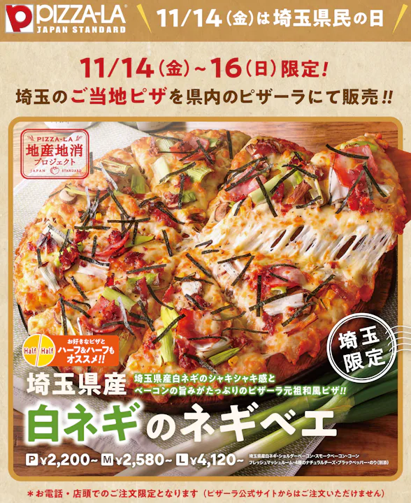 宅配ピザ「PIZZA-LA」は、「ピザーラ地産地消プロジェクト」の一環として、埼玉県産の白ネギを使用したピザ『白ネギのネギベエ』を、2025年11月14日(金)~11月16日(日)の3日間、埼玉県内の「PIZZA-LA」51店舗にて期間限定販売いたします。