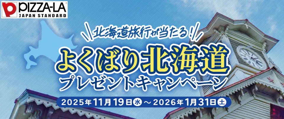 宅配ピザ「PIZZA-LA」は、2025年11月19日(水)よりピザーラ公式サイト会員(メルマガ受け取り設定「可」の方)に様々なプレゼントが抽選で当たる「よくばり北海道プレゼントキャンペーン」を開催します。
