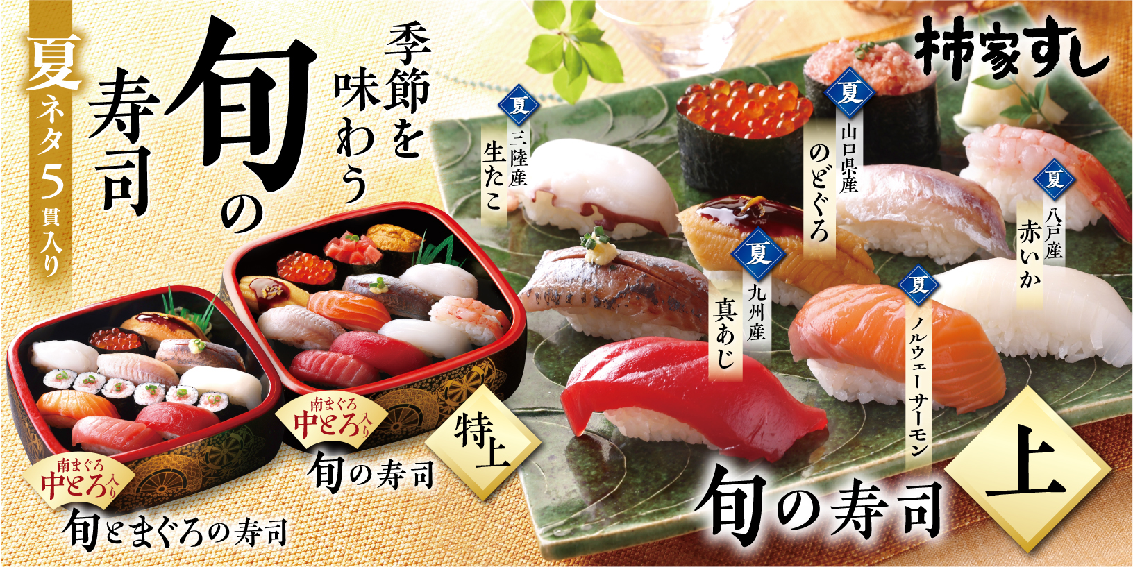2025.06.09柿家すし季節を味わう 柿家すし の「旬の寿司 夏」新発売!! 「のどぐろ」「真あじ」「赤いか」「ノルウェーサーモン」「生たこ」期間限定:2025年6月9日(月)~2025年8月31日(日)出前寿司「柿家すし」では、2025年6月9日(月)から、夏の旬ネタを盛り込んだ『旬の寿司 夏』の販売を開始いたします。資料をダウンロード