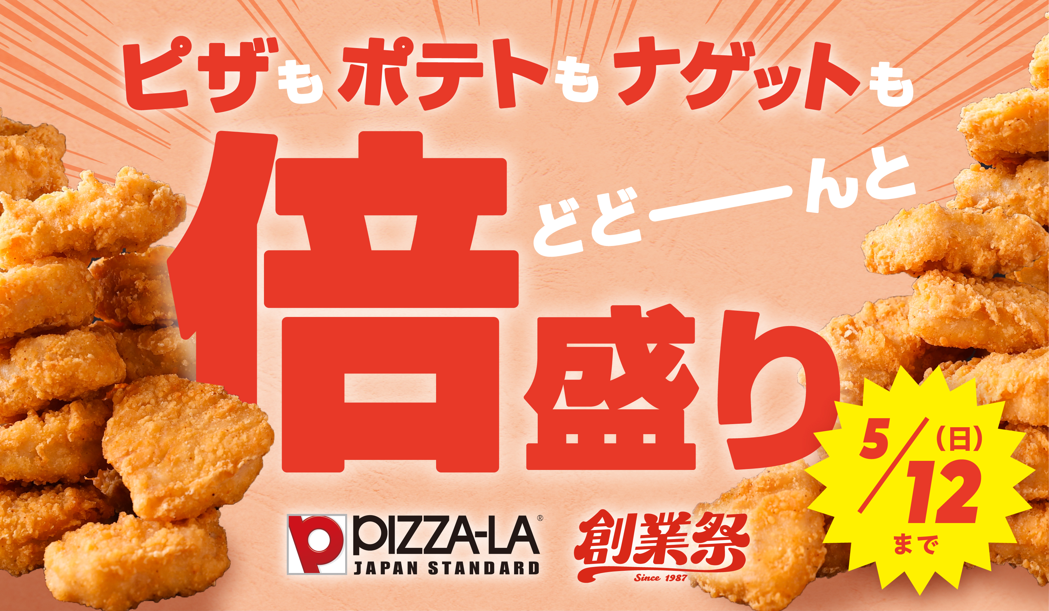 2024.03.28ピザーラピザーラ創業祭どどーんと 倍盛り メニューが登場!! ピザもポテトもナゲットも!!圧倒的なボリューム感!! 株2024年3月28日(木)~5月12日(日) ※ピザーラ公式サイト限定宅配ピザ「PIZZA-LA」は、本日より開催の『ピザーラ創業祭』で、「倍盛りキャンペーン」を実施いたします。資料をダウンロード