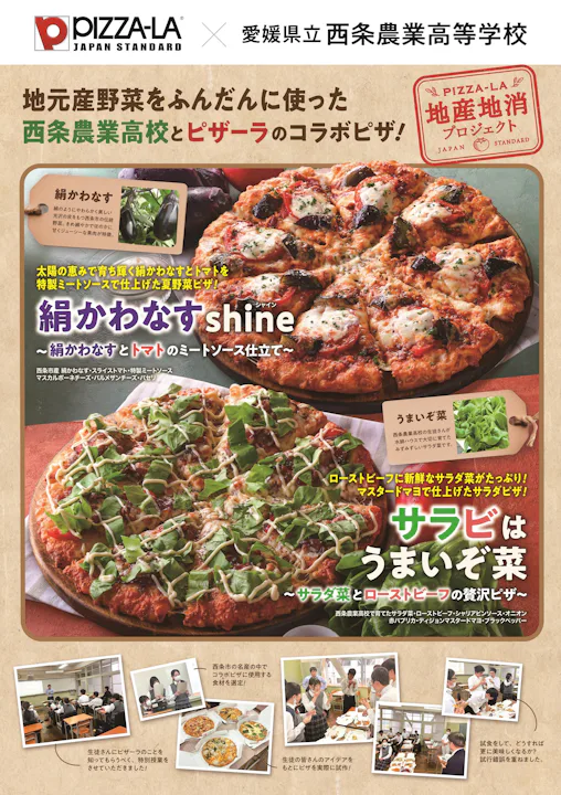 宅配ピザ「PIZZA-LA」は、キッチンカーで全国を巡る「ピザーラキャラバン」の活動として、地方自治体・団体やメディアと連携をとり、その土地の食材を使い、地元の方々と一緒に、その地域を盛り上げていくピザを開発・販売する「地産地消プロジェクト」を発足。今回、愛媛県庁サポートのもと、「地産地消プロジェクト」として愛媛県立西条農業高校と連携し、地元食材を使用したオリジナルピザの開発をスタート。生徒たちのアイデアと想いが詰まった2商品「絹かわなすshine~絹かわなすとトマトのミートソース仕立て~」と、「サラビはうまいぞ菜~サラダ菜とローストビーフの贅沢ピザ~」がついに完成いたしました。