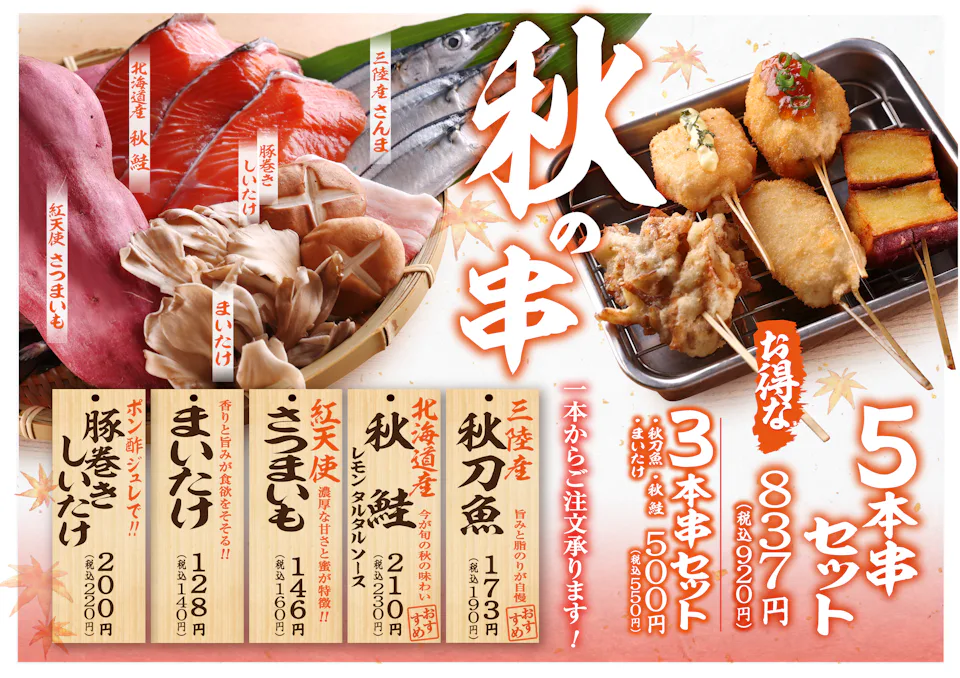 「串かつ でんがな」の旬の味覚を味わう『秋の季節串』 秋刀魚、さつまいも、まいたけを串かつで! タルタルソースやポン酢ジュレ付きのメニューも新登場