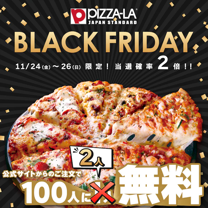 宅配ピザ「PIZZA-LA」は、「ピザーラ感謝祭」で実施中の『100人に1人無料』キャンペーンを、ブラックフライデー期間中、『100人に2人無料』に当選確率を2倍にして開催いたします。