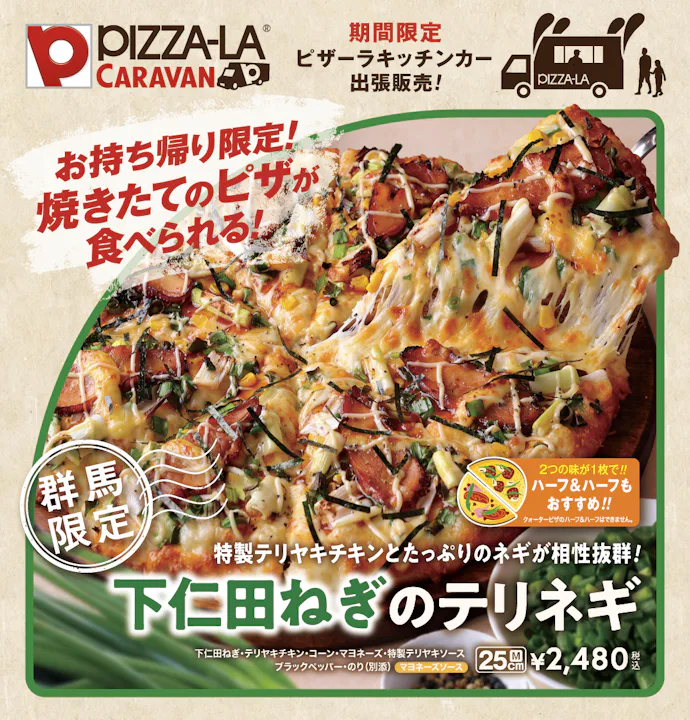 宅配ピザ「PIZZA-LA」は、移動販売「ピザーラキャラバン」で、出店場所となる群馬県の特産品「下仁田ねぎ」を使った特別メニュー『下仁田ねぎのテリネギ』を期間限定で出張販売いたします。