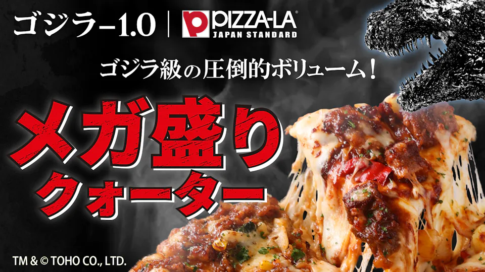 宅配ピザ「PIZZA-LA」は、『ゴジラ-1.0』とのコラボレーションとして、2023年11月9日(木)から期間限定で、コラボ商品「メガ盛りクォーター」「メガ盛りバスケット」「メガ盛りピザセット」3商品を発売いたします。