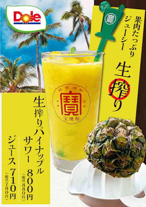 「Dole」×『串かつとお酒 でんがな』 生パイナップルをたっぷり半分使用したコラボドリンクが初登場! 「生搾りパイナップルサワー」「生搾りパイナップルジュース」