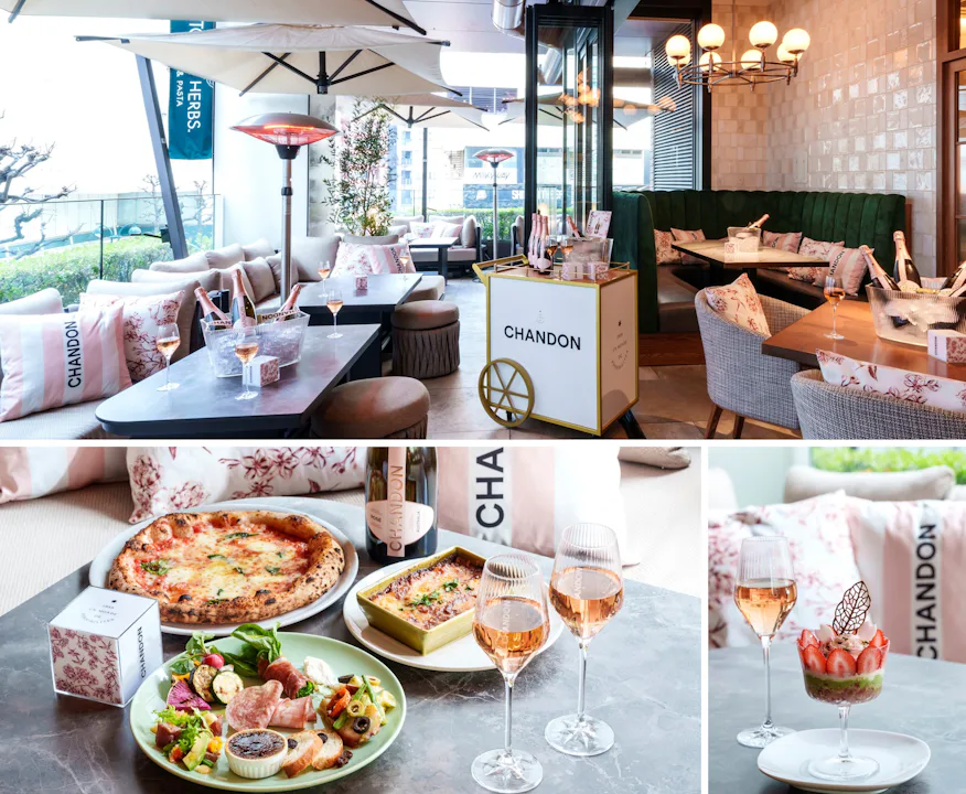 イタリアンレストラン『TO THE HERBS (トゥ・ザ・ハーブズ) 渋谷店』(所在地:東京都渋谷区宇田川町4-3lyf渋谷東京2階)では、2025年4月20日(日)までの期間限定でプレミアムスパーグリングワイン「シャンドン ロゼ」を楽しめる「テラス限定セット」を販売致します。
