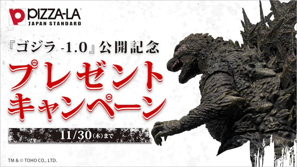 宅配ピザ「PIZZA-LA」は、『ゴジラ-1.0』とのコラボレーションとして、2023年11月3日(金・祝)から映画のオリジナルグッズが当たるSNSプレゼントキャンペーン、さらに11月9日(木)からは公式サイトでのマストバイプレゼントキャンペーンを開始いたします。