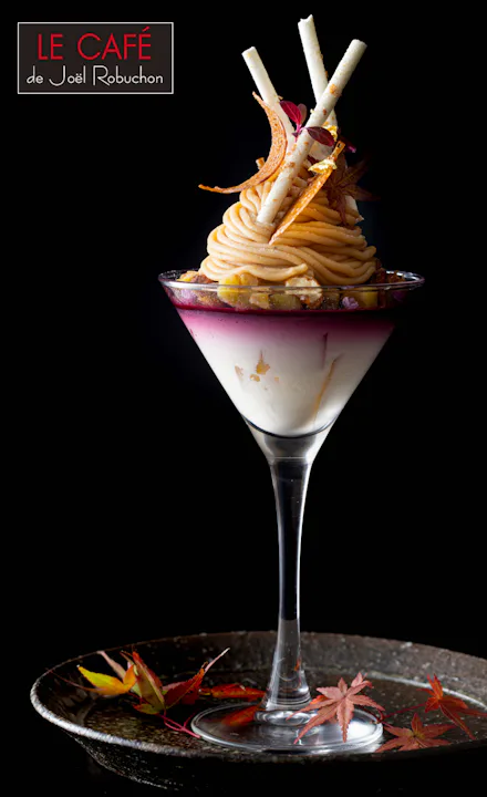 【1日20食限定 秋の新作パフェ】 ル カフェ ドゥ ジョエル・ロブションより新登場! 「栗パフェ モンブラン仕立て洋梨とカシスをアクセントに」