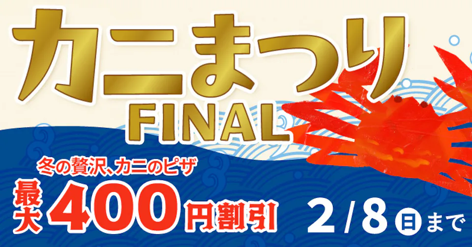 宅配ピザ「PIZZA-LA」は、「カニまつり」として、ピザーラ冬の代名詞であるカニのピザ4種を対象に、デリバリー注文で最大400円割引となるキャンペーンを、2026年1月29日(木)から2月8日(日)までの期間、ピザーラ公式サイト限定で開催いたします。